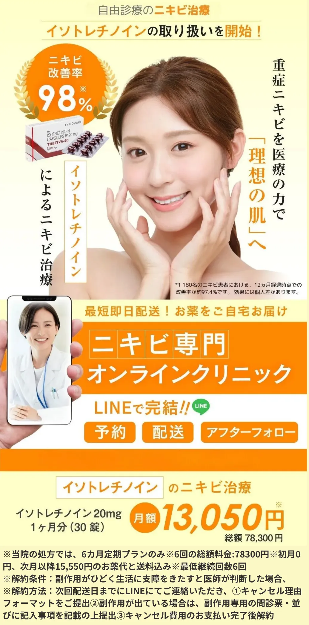 また、イソトレチノインの好転反応として、お薬の服用を開始して最初の1〜2週間で「一時的にニキビの症状」が悪化する場合があります。肌が生まれ変わろうとして細胞が活性化している証拠となります。
