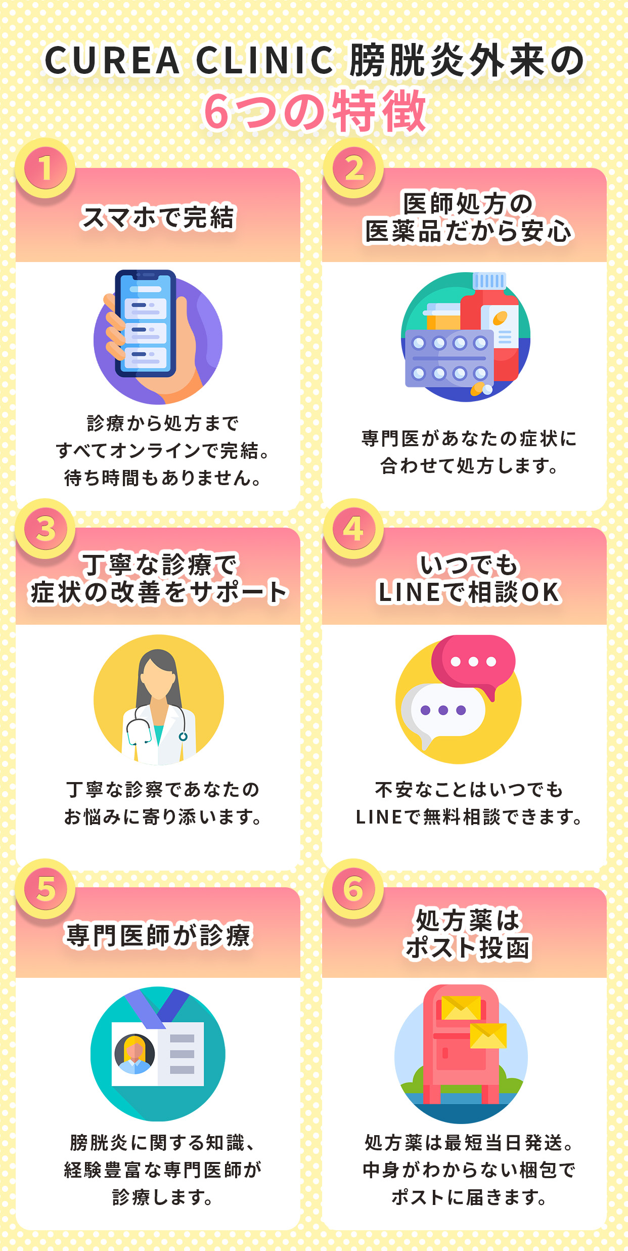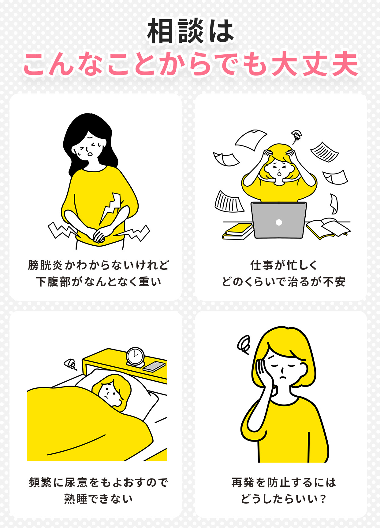 トイレに行く回数が増える、排尿時に痛む、尿を出し終わっても残尿感がある、尿が濁る、などの症状が出ることが多いです。